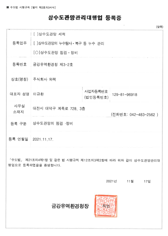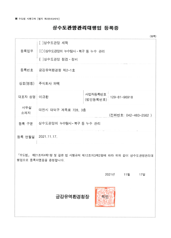 상수도관망관리대행업 등록증 (누수)
