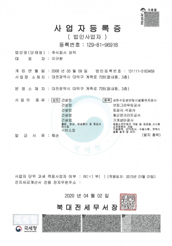 (주)와텍 사업자등록증