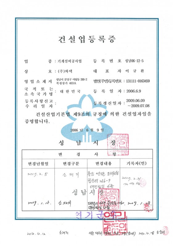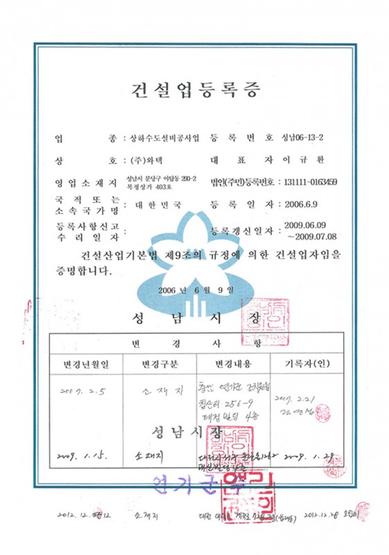 상하수도 설비공사업 등록증