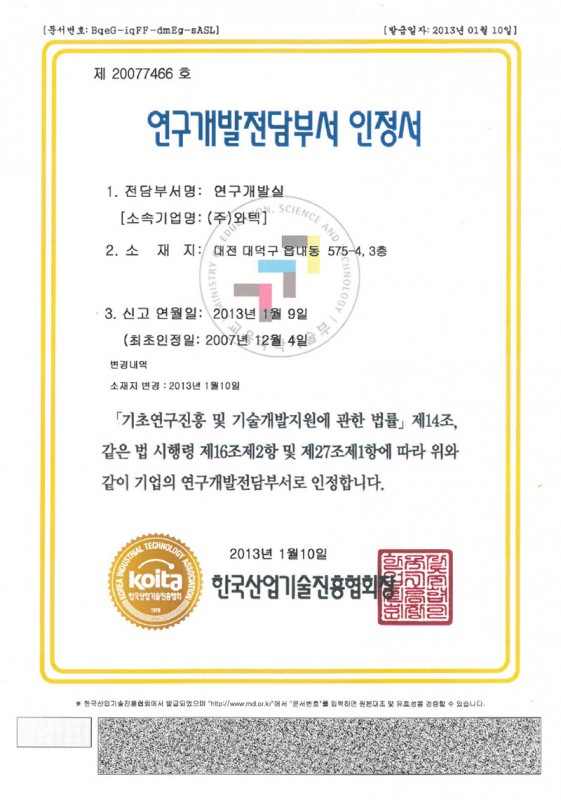[ 34366 ] 대전 대덕구 대화로 120, 가온비즈타워 508-512호 (주)와텍