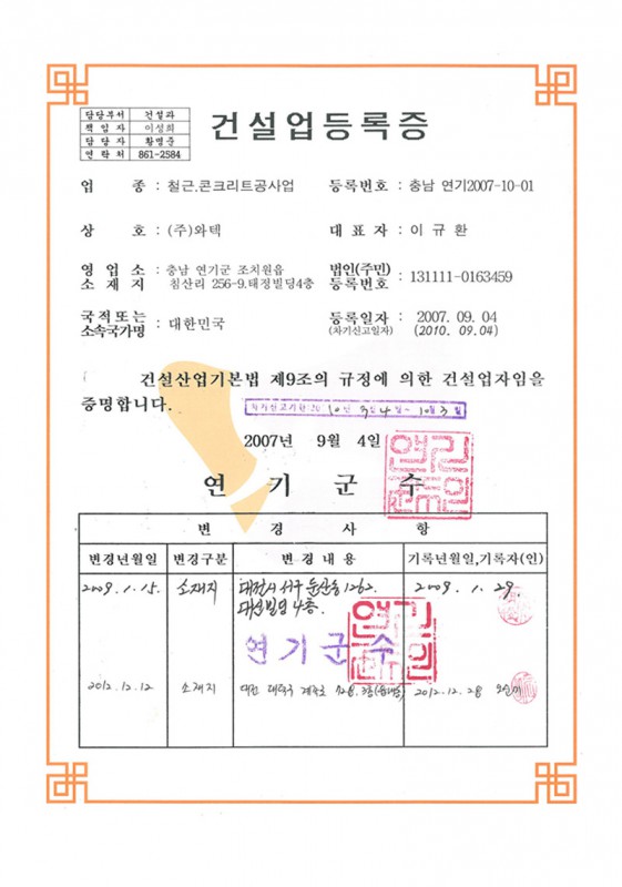 철근 콘크리트 공사업 등록증